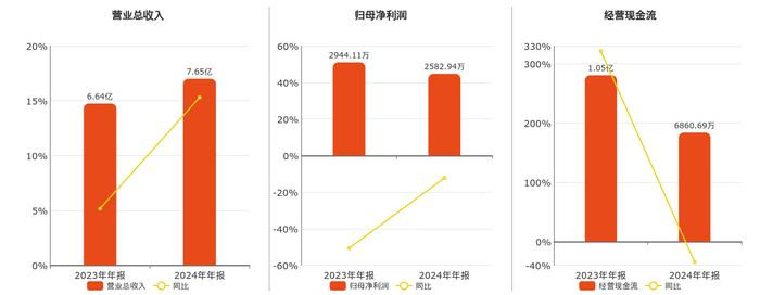 公司营业总收入为7.65亿元,在已披露的同业公司中排名第99。归母净利润为2582.94万元,在已披露的同业公司中排名第118,较去年同报告期归母净利润减少361.17万元,同比较去年同期下降12.27%。经营活动现金净流入为6860.69万元,在已披露的同业公司中排名第89,较去年同报告期经营活动现金净流入减少3611.93万元,同比较去年同期下降34.49%。